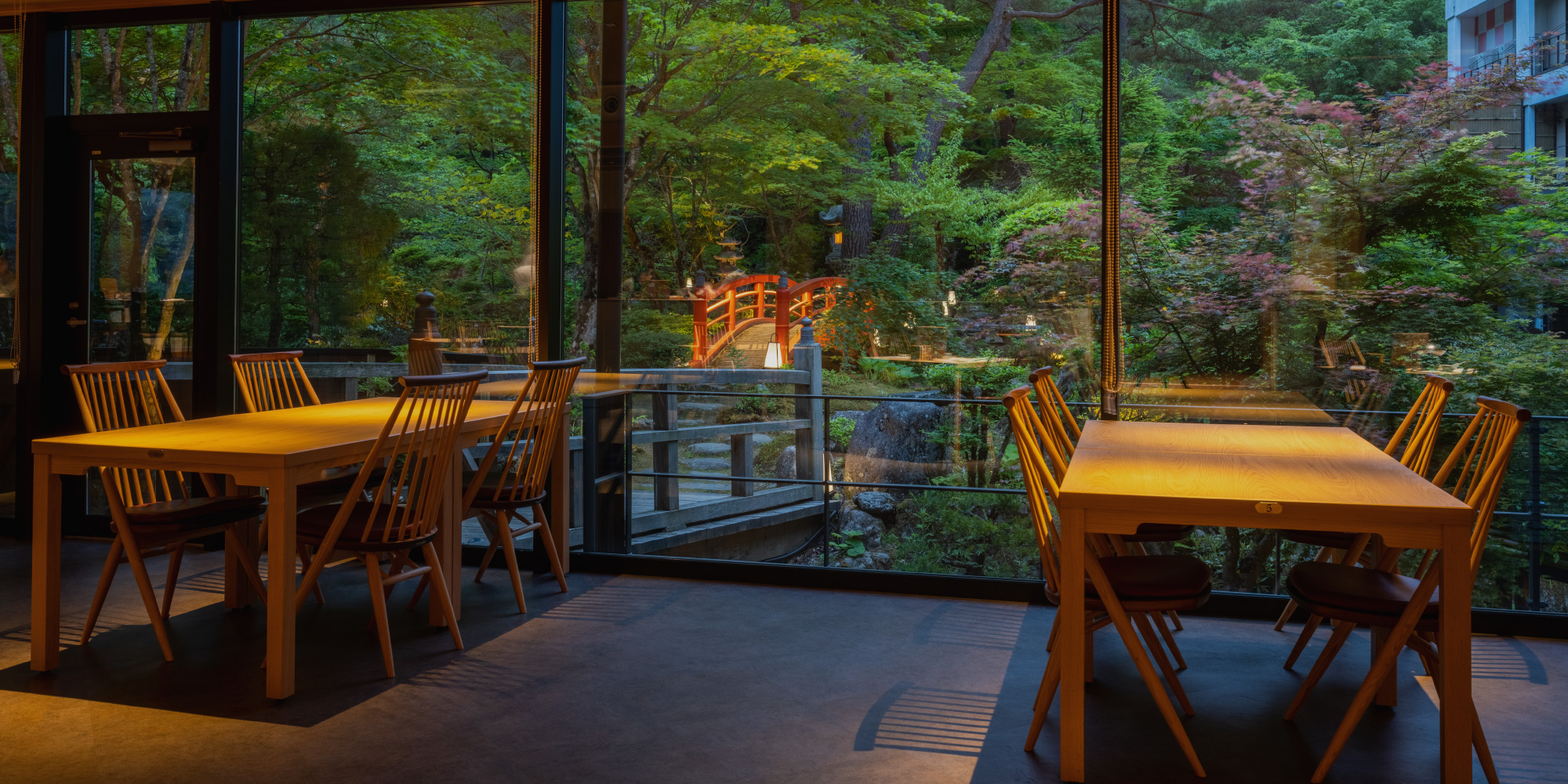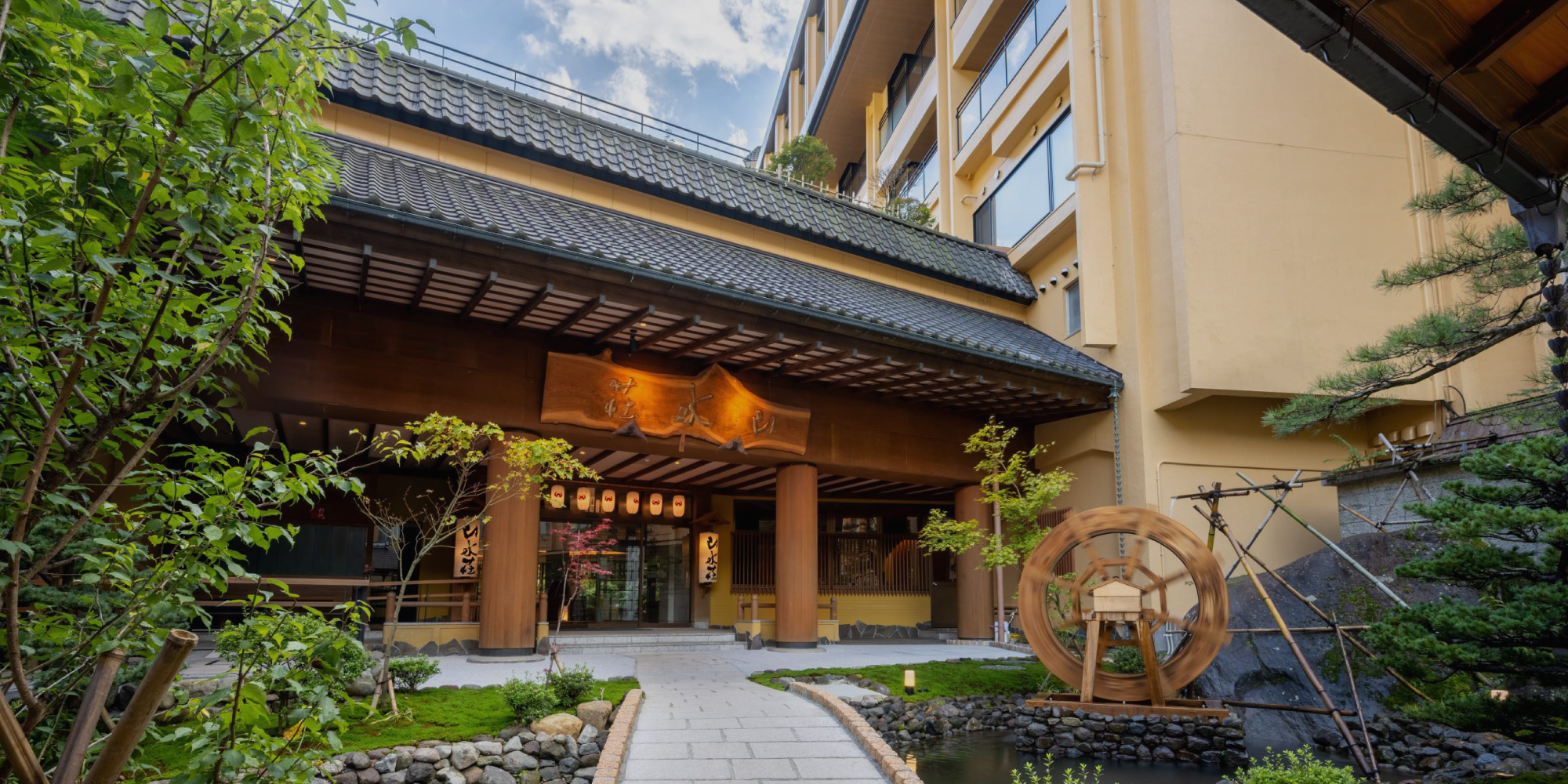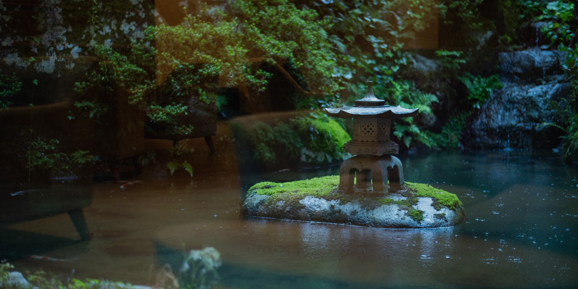 エントランスの水車の水音が奏でる、おもてなし。四季、時間帯によって表情を変える美しい庭園が癒しの時間を与えてくれます。
