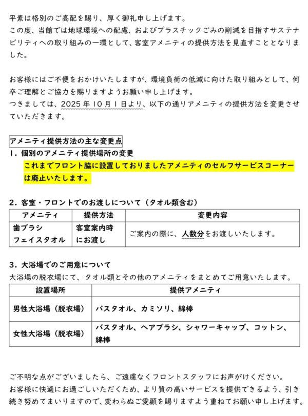 アメニティ提供方法変更のご案内