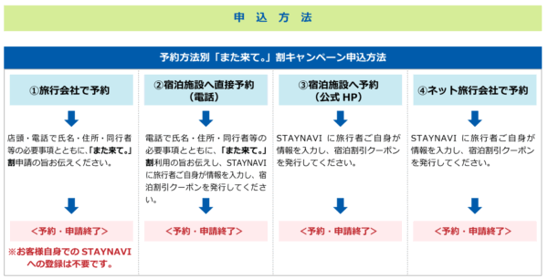 ※オンライン予約サイトのクーポンや、その他割引などの併用は可能です。(割引の順序は問わず、「また来て。」割を適用いただく時点で宿泊代金がお一人様あたり1泊8,000円税込み以上の場合に適用可能)