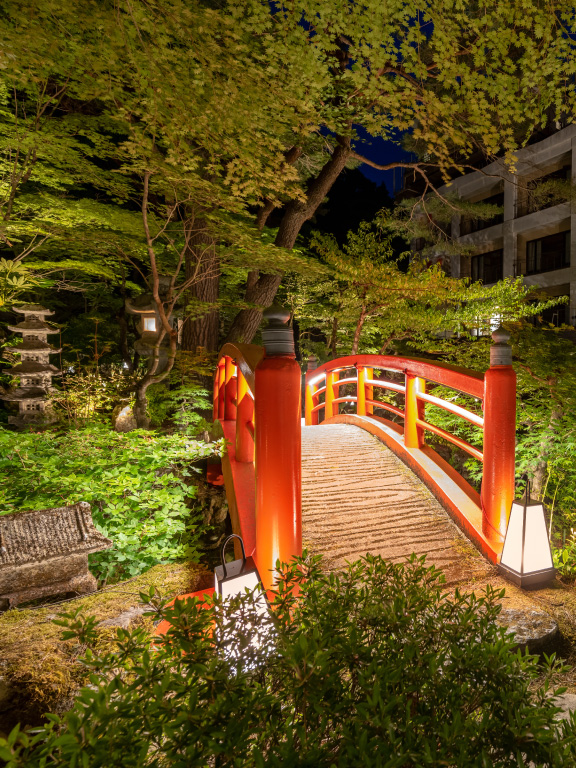 入口處水車的潺潺水聲,奏出迎賓的款待。隨著四季與時段變化展現不同風貌的美麗庭園,為您帶來身心療癒的時光。